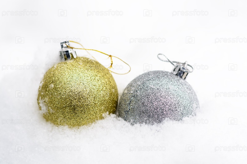 Елочные игрушки в снегу