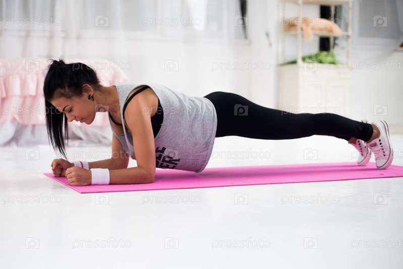 Девушка стоит в нижней планке