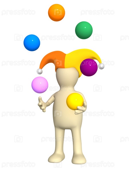 Стилизованный человечек-клоун, жонглирующий разноцветными шарами