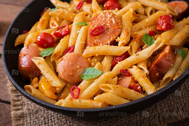 Паста с колбасками и овощами