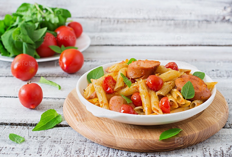 Паста с колбасками и овощами