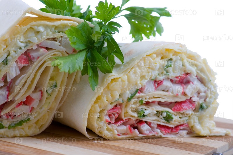 Пита с крабовыми палочками на разделочной доске