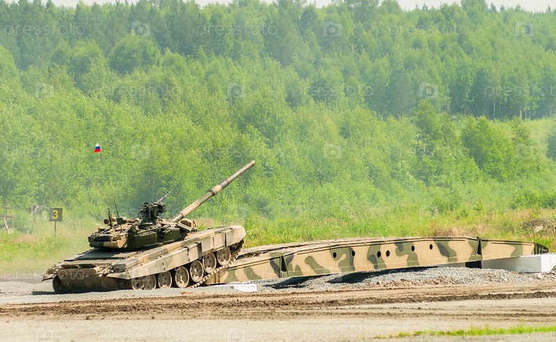 Танк Т-80 дисков на мосту индуцированной через препятствие