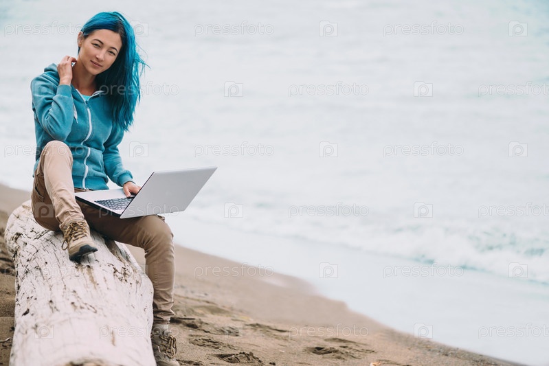 Фрилансер девушка с ноутбуком на побережье