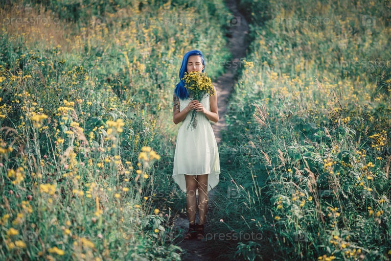 Девушка с синими волосами в поле с цветами