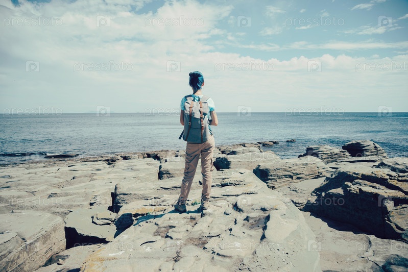 Девочка путешественник, наслаждаясь видом на море