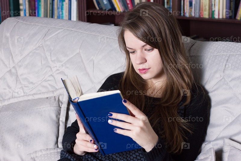 Женщина в библиотеке, читая книгу
