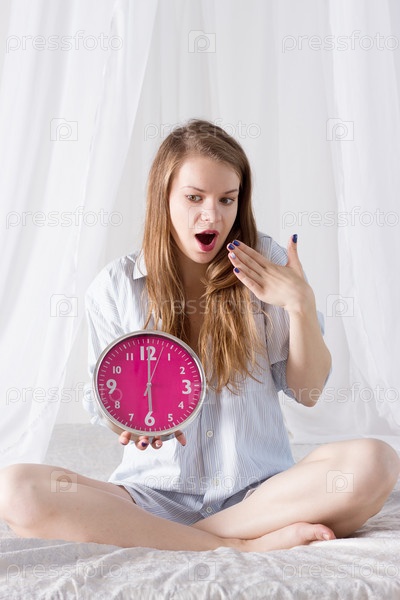 Девушка с большими розовыми часами утром в постели