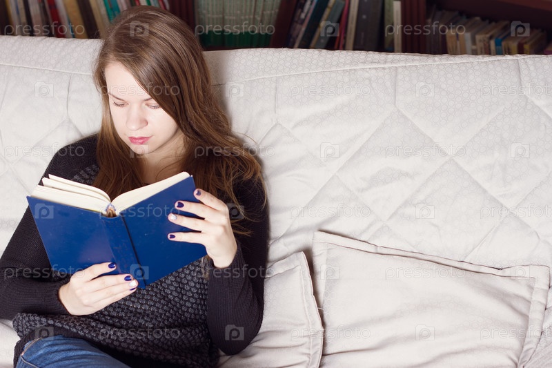 Молодая женщина, читая книгу на диване