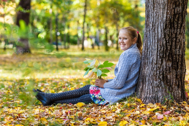 Девочка в лесу сидит у дерева
