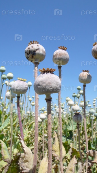 Созревшие маковые головки на фоне голубого неба