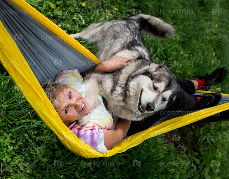 Счастливая девушка с собакой в гамаке
