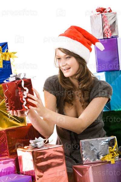 Изображение привлекательной девушки, которая смотрит на коробку с подарками рядом