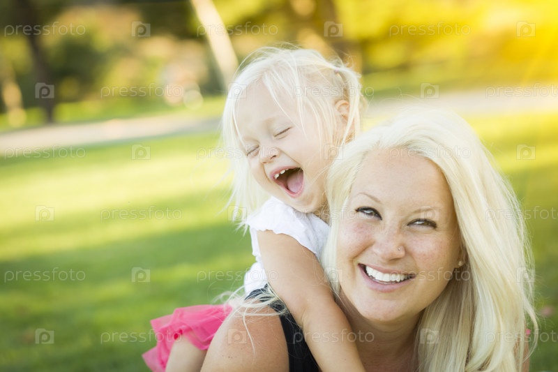 Мать и маленькая девочка, весело вместе в траве