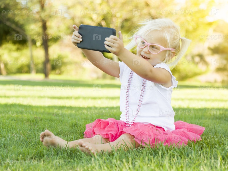 Маленькая девочка в траве делает селфи с сотового телефона