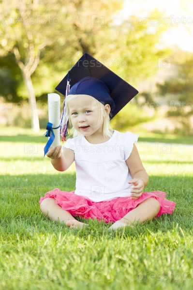 Маленькая девочка в траве кепке окончания проведения диплом с лентой