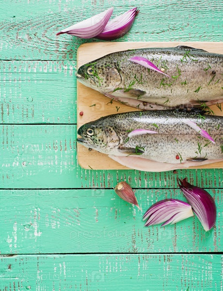 Свежая сырая рыба с луком и лимоном