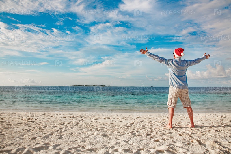 Человек в шляпе Санта на тропическом пляже