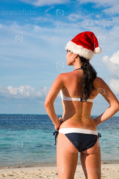Женщина в шляпе Санта на пляже