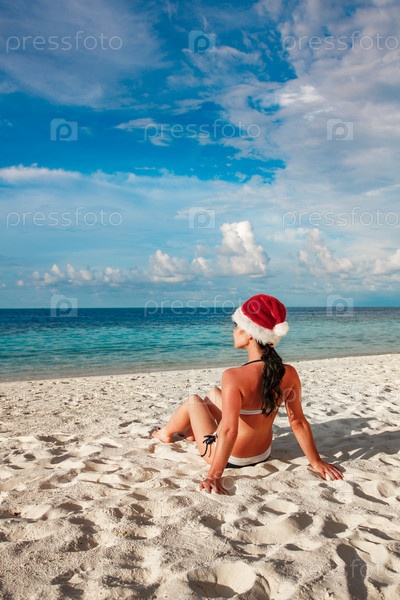 Женщина в шляпе Санта на пляже