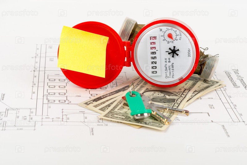 Красный водосчетчик с наличными и ключи по проекту