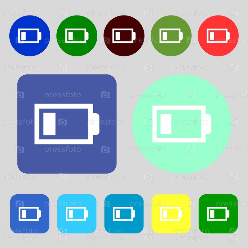 Значок батареи низкий уровень входа. Символ электроэнергии. 12 цветных кнопок. Плоский дизайн. Вектор