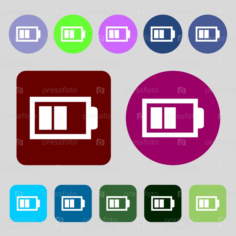 Значок батареи половину уровня знак. Символ низкого электричество. 12 цветных кнопок. Плоский дизайн. Вектор