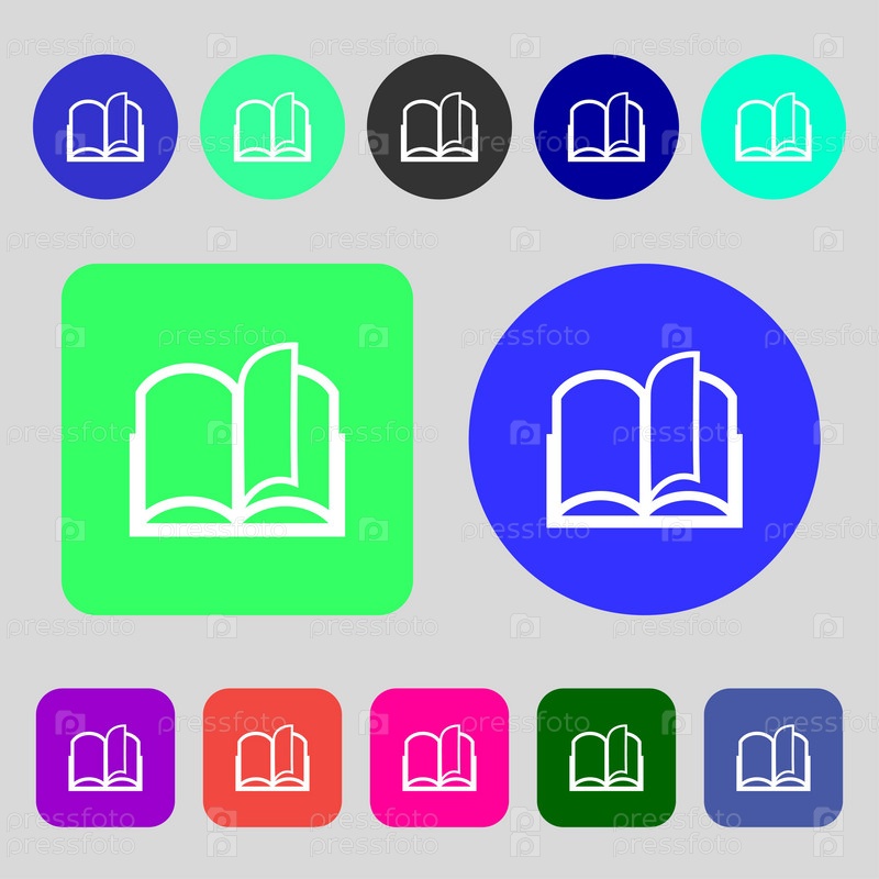 Знак значок книги. Открытая книга символ. 12 цветных кнопок. Плоский дизайн. Вектор