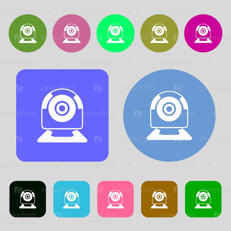 Иконка веб-камера знак. Веб видео чат символ. Камера чат. 12 цветных кнопок. Плоский дизайн. Вектор