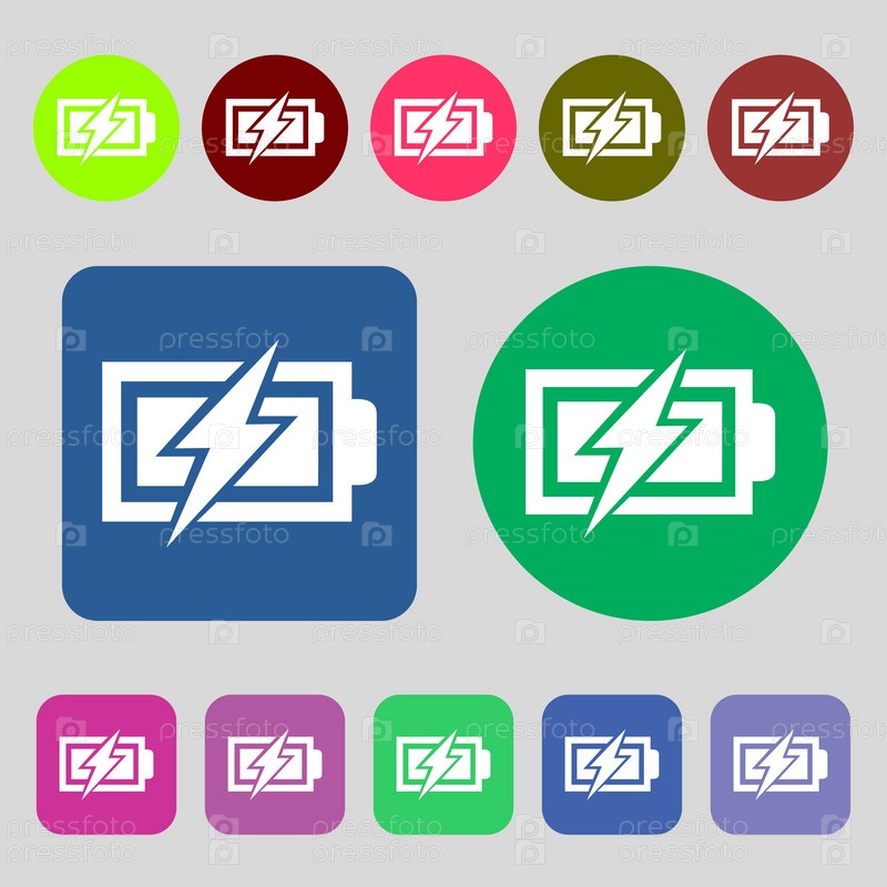 Зарядки знак значок батареи. Символ молния. 12 цветных кнопок. Плоский дизайн. Вектор