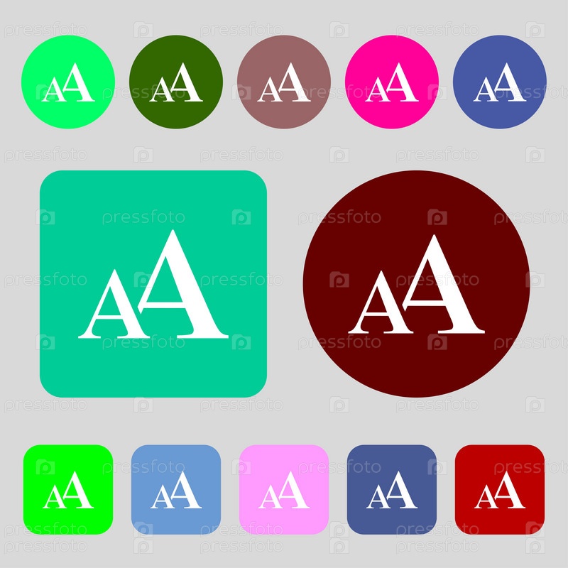 Увеличьте шрифт, знак значка АА. 12 цветовых кнопок. Плоский дизайн. Вектор
