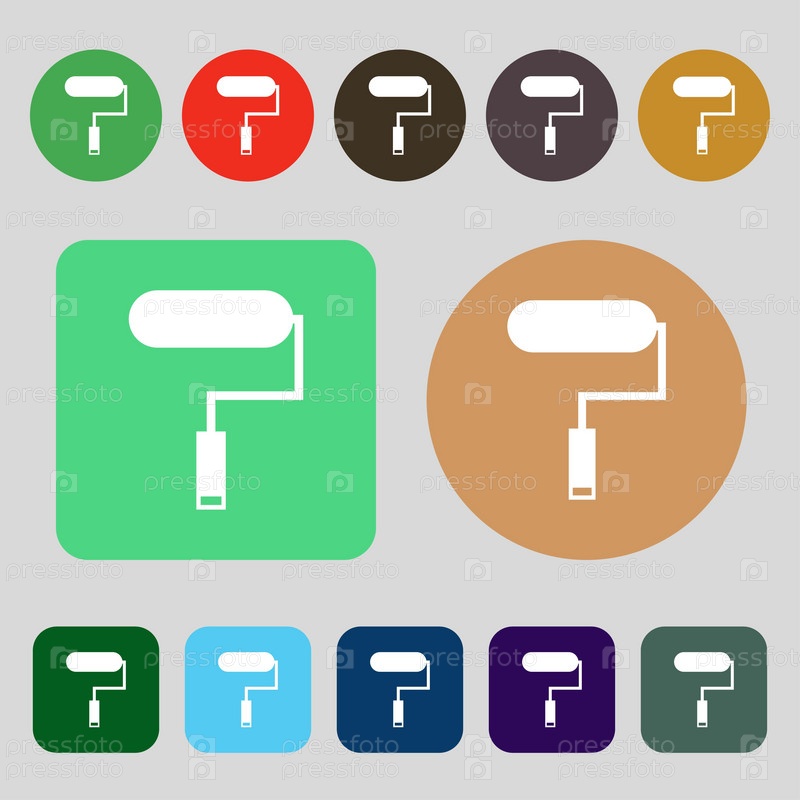 Краской валик знак значок. Значок инструмента живопись. 12 цветных кнопок. Плоский дизайн. Вектор
