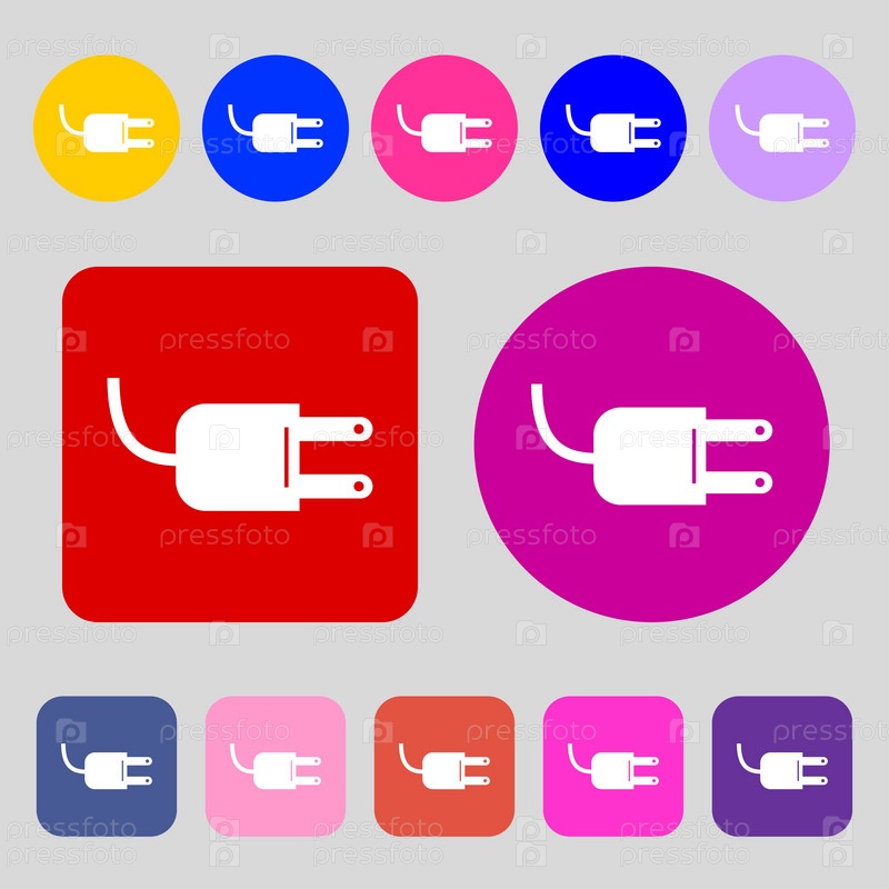 Электрическая вилка знак значок. Символ мощность энергии. 12 цветных кнопок. Плоский дизайн. Вектор