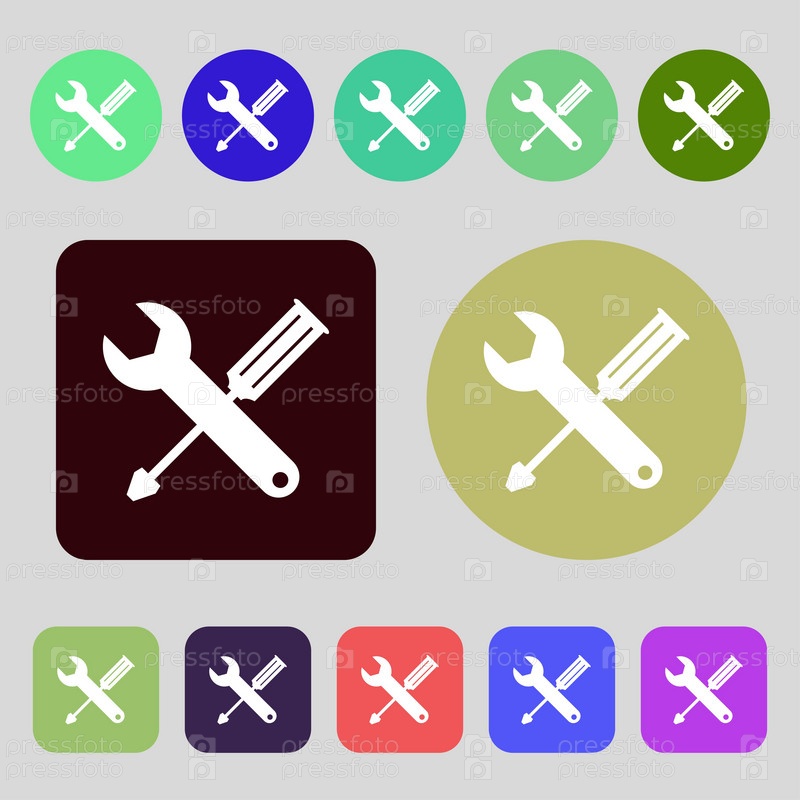 Ремонт инструмента знак значок. Символ службы. Отвертка с помощью гаечного ключа. 12 цветных кнопок. Плоский дизайн. Вектор
