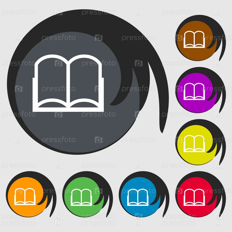 Знак значок книги. Открытая книга символ. Символы на восьми цветных кнопок. Вектор