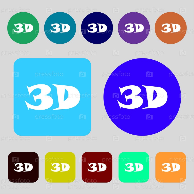 Иконка 3D знак. Символ новой технологии 3D. 12 цветовых кнопок. Плоский дизайн. Вектор