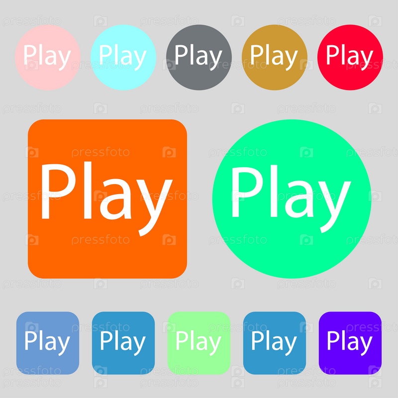 Играть значок знак. символ. 12 цветных кнопок. Плоский дизайн. Вектор