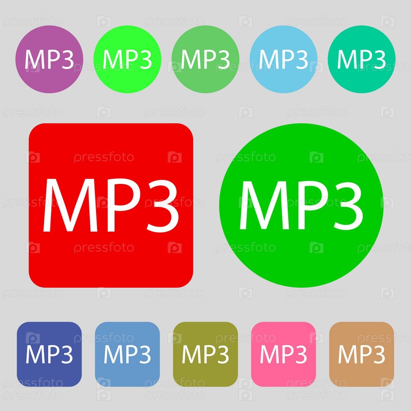 Знак знака формата MP3 музыка. Музыкальный символ. 12 цветовых кнопок. Плоский дизайн. Вектор