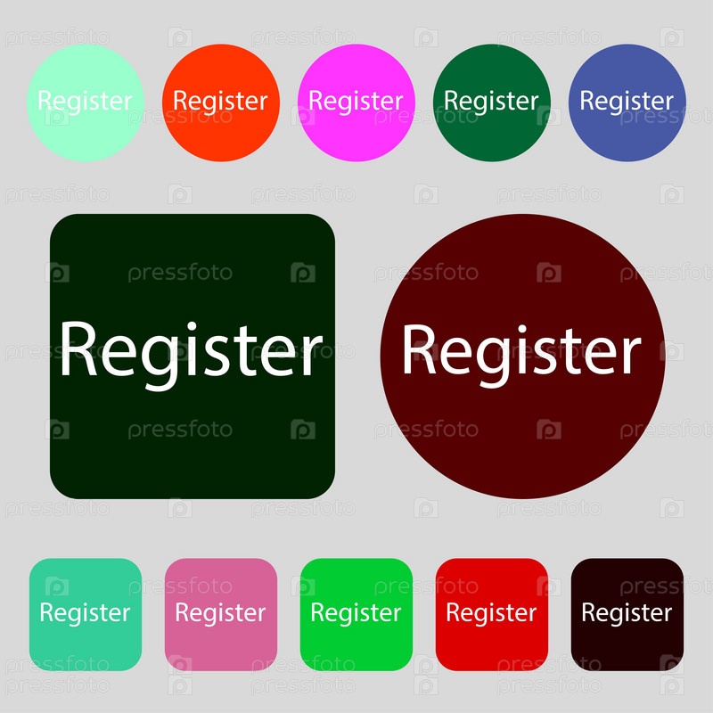 Зарегистрируйте знак значок. Символ членства. Навигация по сайту. 12 цветных кнопок. Плоский дизайн. Вектор