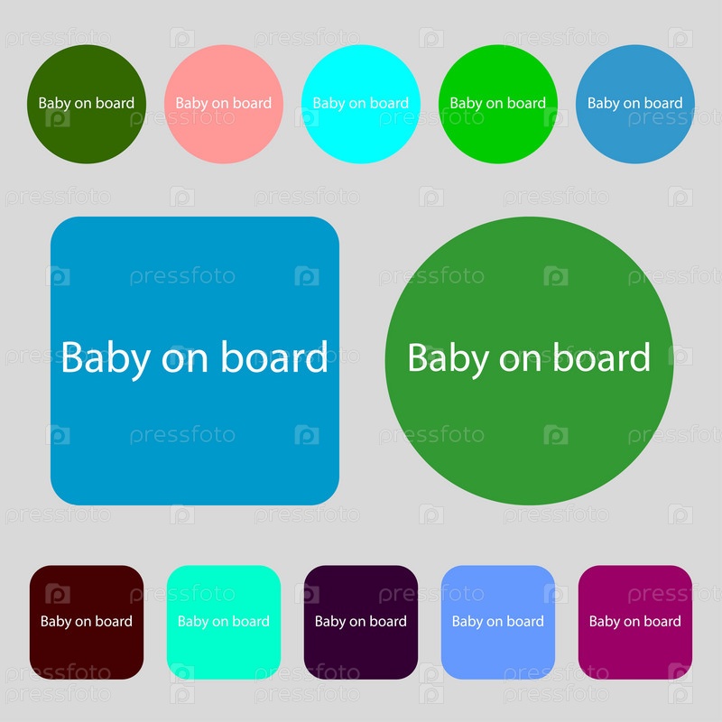 Ребенок на борту значок значка. Детские автомобили - символ осторожности. 12 цветных кнопок. Плоский дизайн. Вектор