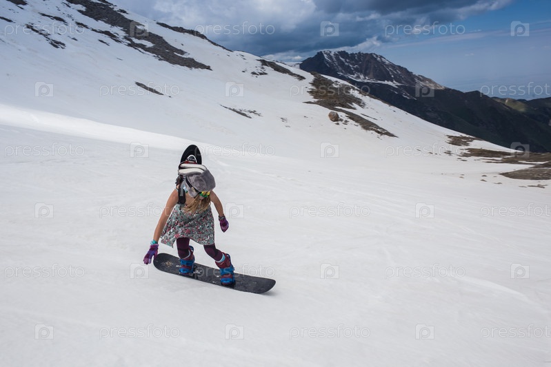 Девушка едет на сноуборде с горы