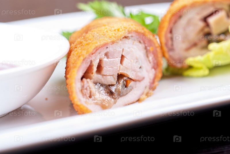 Рулетики из свинины, шампиньонов, сыра и соуса