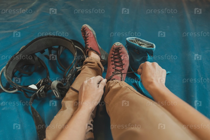 Женщина надевает скальные туфли