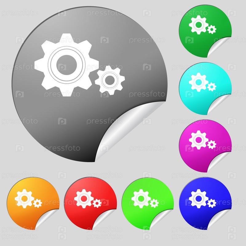 Винтик настройки значок знак. Зубчатое колесо передаточного механизма символ. Набор из восьми разноцветных круглых кнопок, стикеров. Вектор