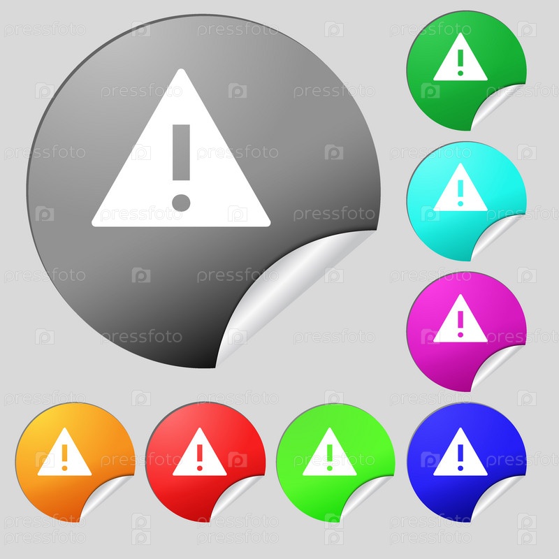 Изображение знака внимания. Восклицательный знак. Символ предупреждения об опасности. Набор из восьми цветные круглые кнопки, наклейки. Вектор