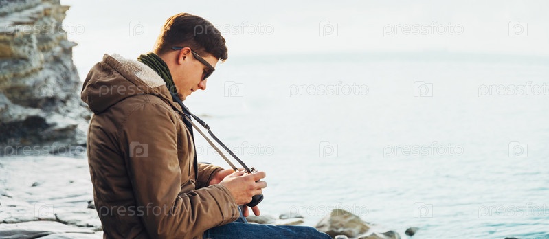 Путешественник с фотокамерой на берегу