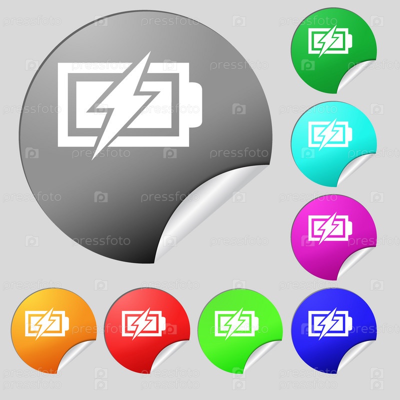Зарядки знак значок батареи. Символ молния. Набор из восьми цветные круглые кнопки, наклейки. Вектор