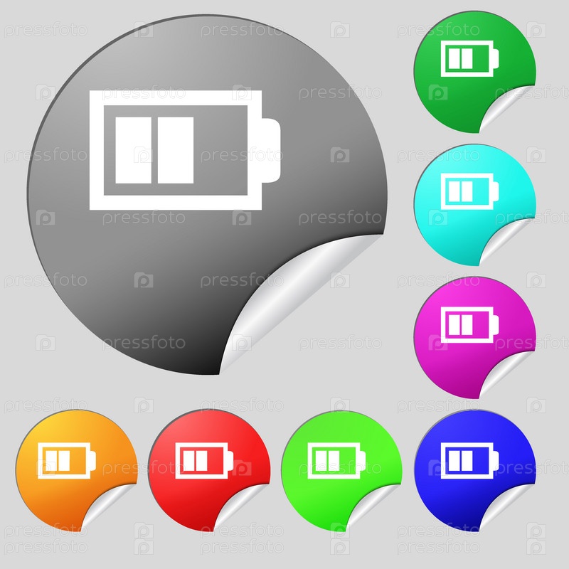 Значок батареи половину уровня знак. Символ низкого электричество. Набор из восьми цветные круглые кнопки, наклейки. Вектор