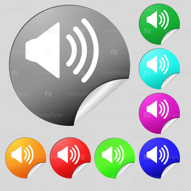 Значок знак громкости динамика. Символ звука. Набор из восьми цветные круглые кнопки, наклейки. Вектор