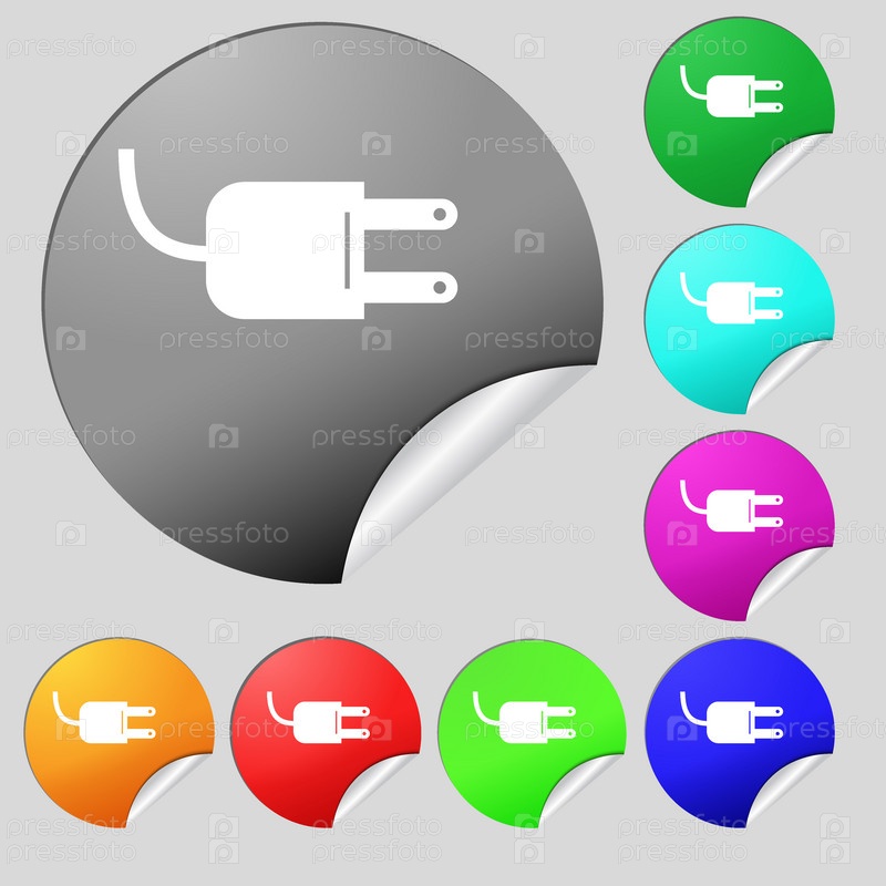 Электрическая вилка знак значок. Символ мощность энергии. Набор из восьми цветные круглые кнопки, наклейки. Вектор